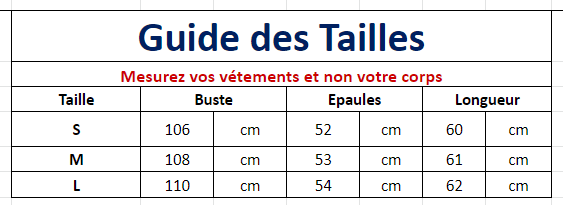 Consultez notre guide des tailles en photo pour choisir la bonne dimension du vêtement. Veuillez vous assurer que vos mensurations sont inférieures aux dimensions indiquées.