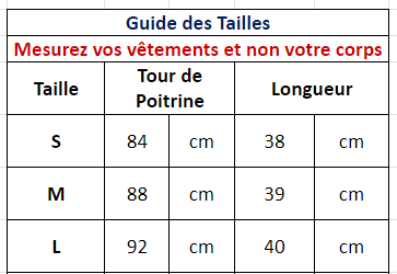 Le guide des tailles en photo indique les dimensions du vêtement. Vos mensurations doivent être inférieures aux dimensions indiquées.