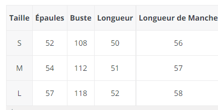 Le guide des tailles en photo indique les dimensions du vêtement. Vos mensurations doivent être inférieures aux dimensions indiquées.