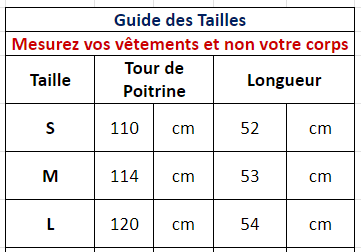 Le guide des tailles en photo indique les dimensions du vêtement. Veuillez vous assurer que vos mensurations sont inférieures aux dimensions indiquées.