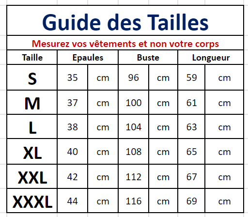 Le guide des tailles en photo indique les dimensions du vêtement. Vos mensurations doivent être inférieures aux dimensions indiquées.