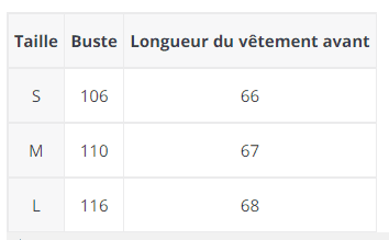 Le guide des tailles sur la photo indique les dimensions du vêtement. Vos mensurations doivent être inférieures aux dimensions indiquées.