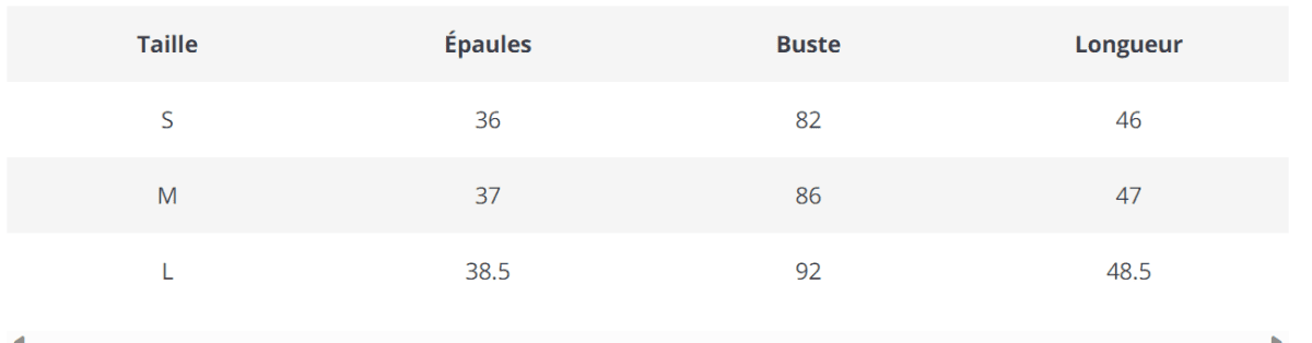Le guide des tailles en photo vous donnera les dimensions du vêtement. Veuillez vous assurer que vos mensurations soient inférieures aux dimensions indiquées.