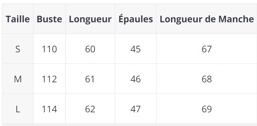 Le guide des tailles sur la photo indique les dimensions du vêtement. Assurez-vous que vos mensurations correspondent à des dimensions inférieures.