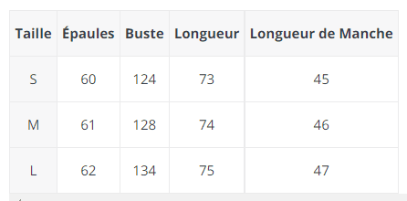 Le guide des tailles en photo indique les dimensions du vêtement. Vos mensurations doivent être plus petites que les dimensions indiquées.
