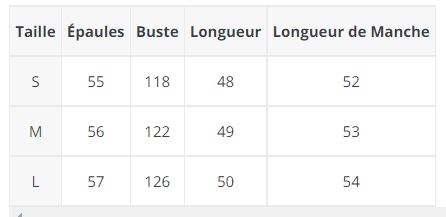 Consultez le guide des tailles sur la photo pour connaître les dimensions du vêtement. Assurez-vous que vos mensurations sont inférieures aux dimensions indiquées.
