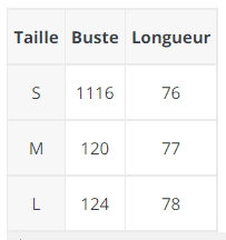Le guide des tailles en photo affiche les dimensions du vêtement. Vos mesures doivent être inférieures aux dimensions mentionnées.