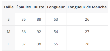 Le guide des tailles sur la photo indique les dimensions du vêtement. Vos mensurations doivent être inférieures aux dimensions indiquées.