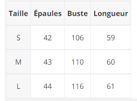 Découvrez les dimensions du vêtement dans le guide des tailles en photo. Assurez-vous que vos mensurations correspondent aux dimensions indiquées.