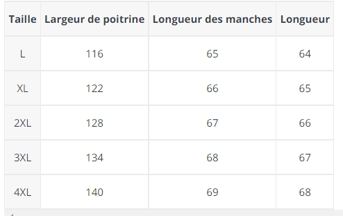 Le guide des tailles sur la photo indique les dimensions du vêtement. Vos mensurations doivent être inférieures aux dimensions indiquées.