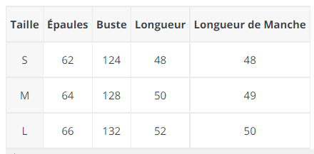 Consultez le guide des tailles en photo pour connaître les dimensions du vêtement. Votre taille doit être inférieure aux dimensions indiquées.