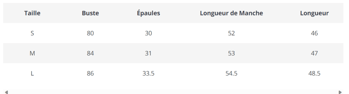 Le guide des tailles en photo renseigne sur les dimensions du vêtement. Vos mesures doivent être inférieures aux dimensions indiquées.