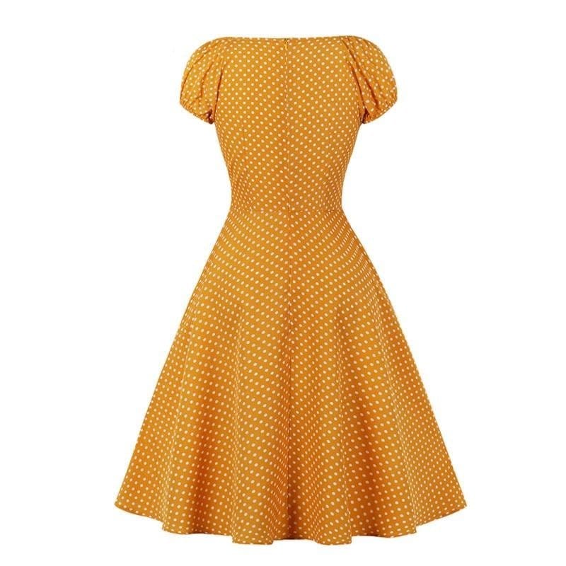Une magnifique Robe Années 50 Jaune à Petits Pois pour ajouter du glamour à votre garde-robe. Cette tenue offre une coupe taille haute et un design inspiré des années cinquante. Complétez cette robe avec un jupon en tulle et vous serez unique pour aller au bal. Vous aurez autant de classe qu’Audrey Hepburn ! Commandez dès maintenant votre taille.