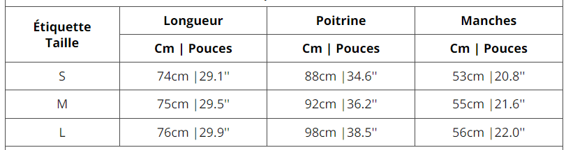Guide des tailles disponible en photo pour choisir la bonne taille