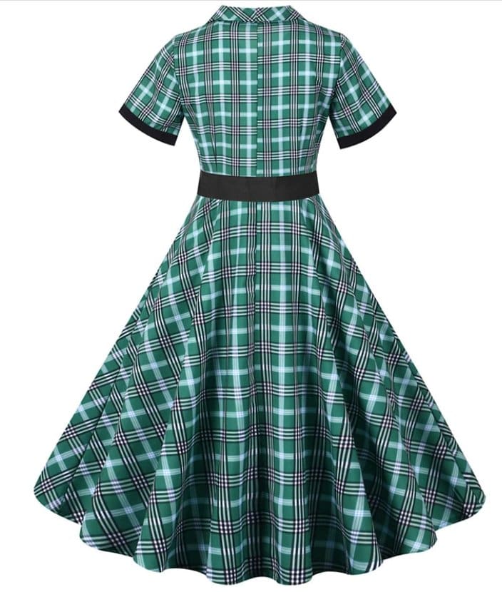 Une superbe robe verte de style année 50 qui ajoute une touche de rock’n’roll à votre tenue. Cette robe trapèze incarne parfaitement le charme des années 50. Complétez votre look avec un petit sac à main et vous serez au sommet de l’élégance pour toutes les occasions. Vous aurez plus de classe qu’Audrey Hepburn ! Vous ne regretterez pas cet achat.