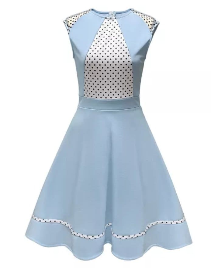 Une magnifique robe vintage femme pas chère à pois bleus qui ajoutera une touche rockabilly à votre tenue. Cette robe des années 50 est un incontournable de la mode du 20ème siècle avec sa coupe évasée et sa féminité. Complétez votre look avec des escarpins et vous serez unique en toutes occasions. Vous serez la plus stylée ! Ne tardez pas à acheter cette robe.