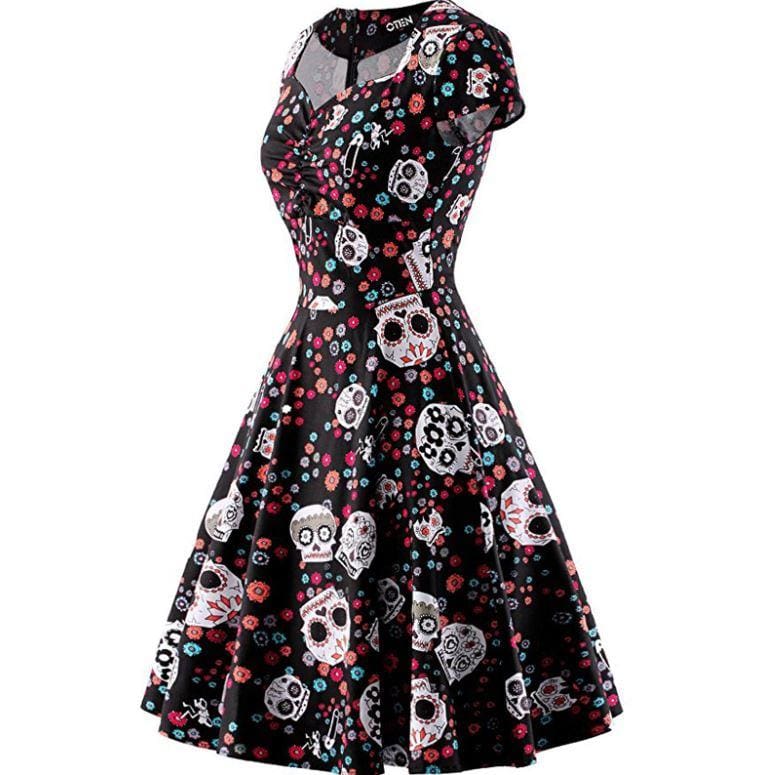Ce magnifique modèle de Robe Vintage Grande Taille Noir Skull vous donnera un look hors du commun. Vous serez séduit par la coupe rétro des années 60 associée à la modernité des têtes de mort. Cette robe vintage est parfaite pour être à la fois chic et effrayante lors d’Halloween. Disponible en grandes tailles.
