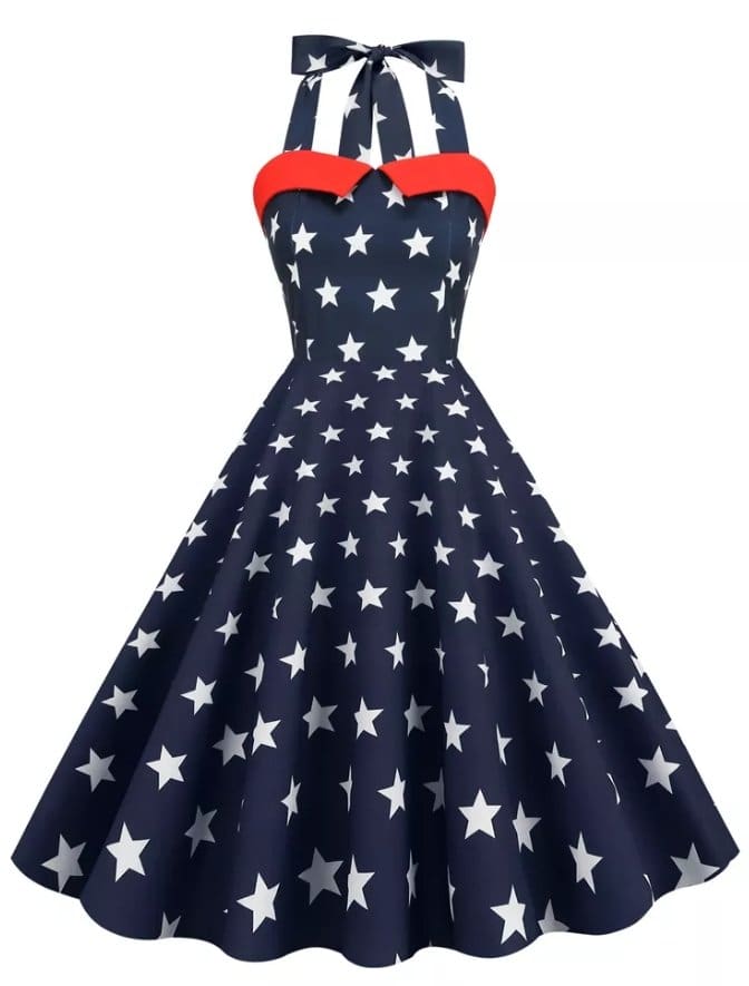 La Robe Rétro Vintage Pin Up Imprimé USA rappelle la tendance des années 60 aux États-Unis. Son style vintage est créé grâce à sa coupe et à son impression représentant les États-Unis.