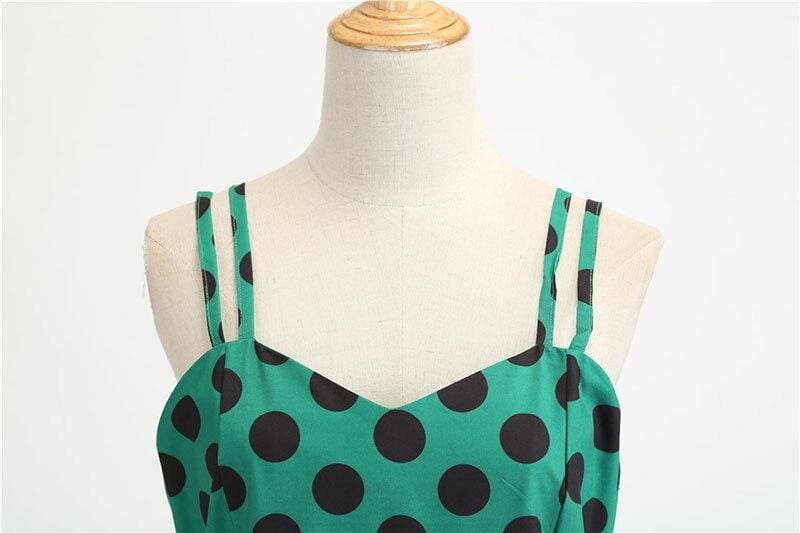 Une superbe Robe Vintage Rockabilly verte à pois noirs! Vous allez être magnifique en portant cette jolie robe au style rétro des années 50. On adore particulièrement le décolleté et le nœud papillon à la taille 🙂
